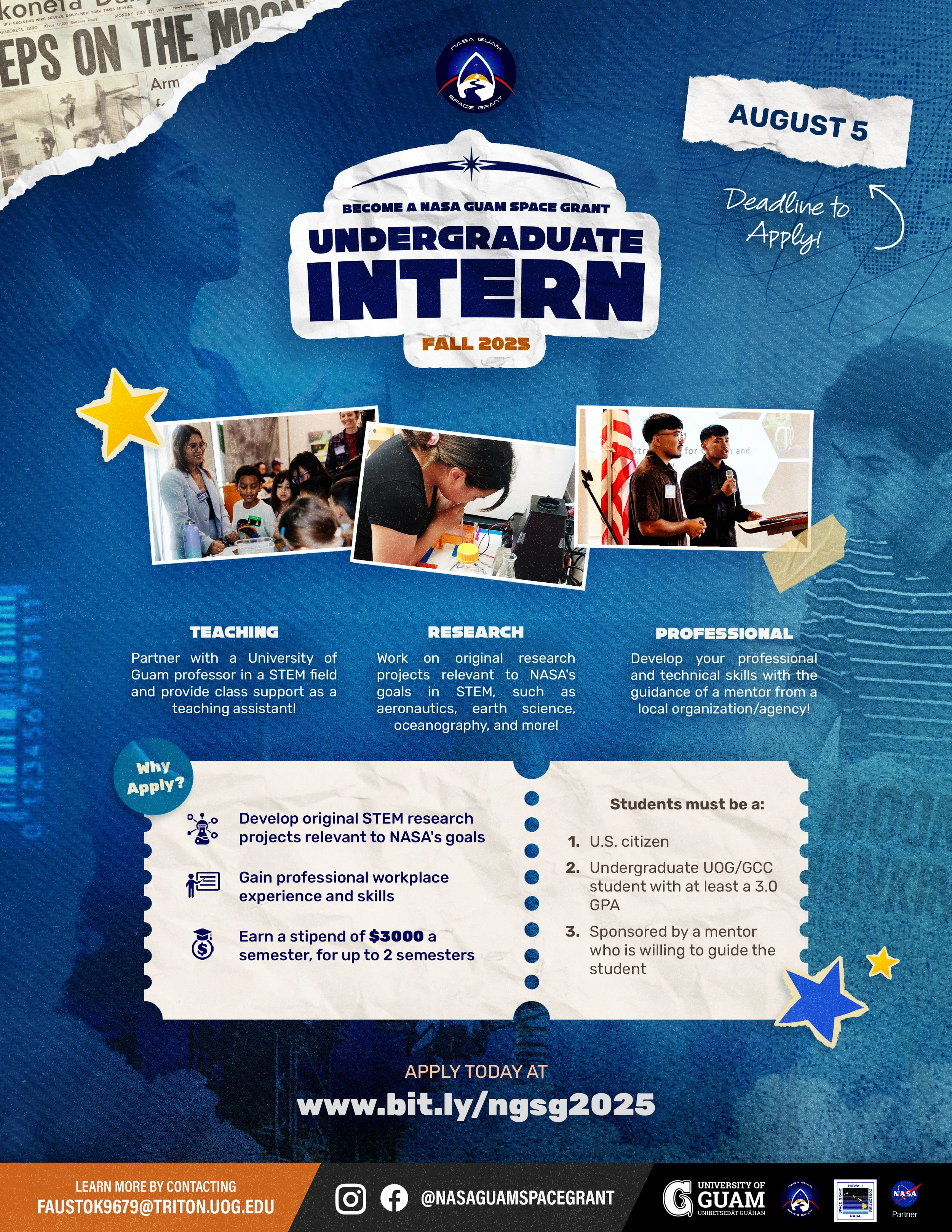 Visit https://www.uog.edu/nasa-guam-space-grant/opportunities to download and complete an application package, and submit it to Dr. Romina King at roking@triton.uog.edu and Keanno Fausto at faustok9679@triton.uog.edu by August 5, 2025.