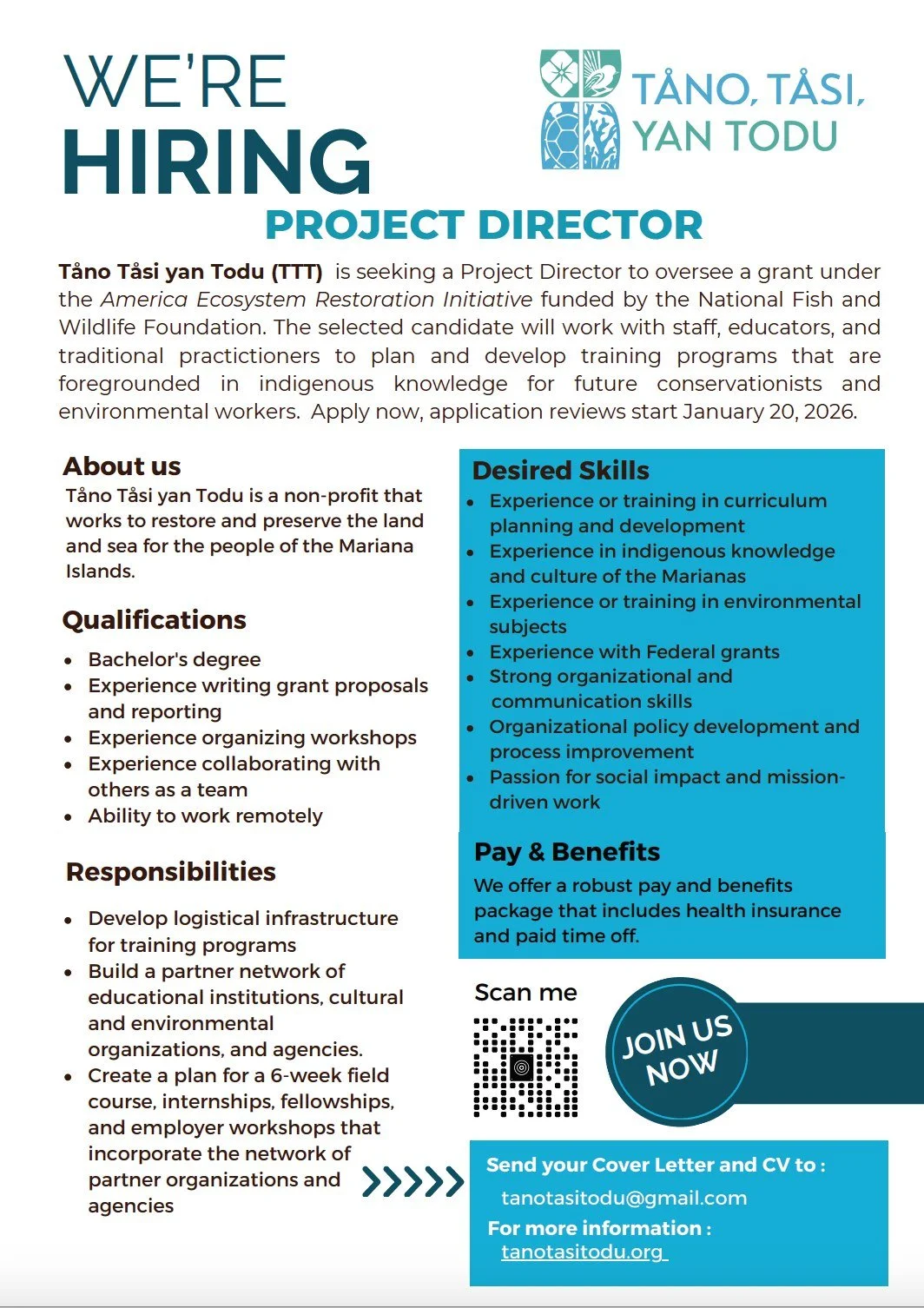 Tåno Tåsi yan Todu (TTT) is seeking a Project Director to oversee a grant under the America Ecosystem Restoration Initiative funded by the National Fish and Wildlife Foundation. The selected candidate will work with staff, educators, and traditional practitioners to plan and develop training programs that are foregrounded in indigenous knowledge for future conservationists and environmental workers.