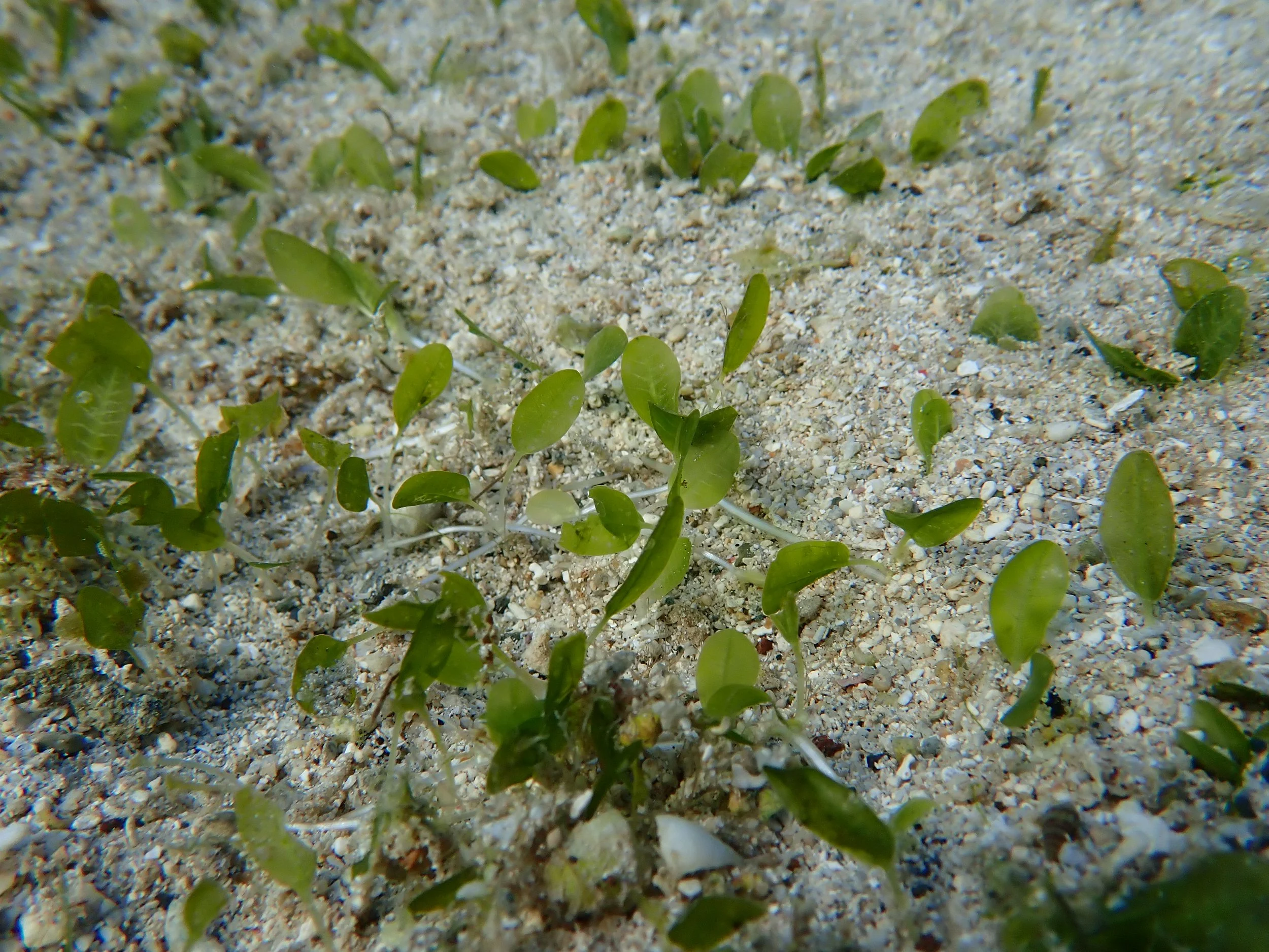 This smaller seagrass, often about 10cm long, can be found mixed in with larger seagrasses or by itself. It helps stabilize sediments and can grow faster than tape grass.